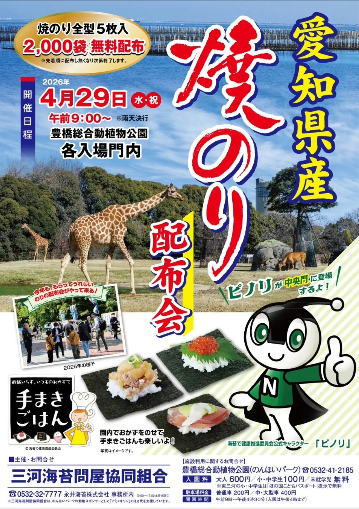 弊社も所属する三河海苔問屋協同組合の恒例行事、のんほいパークでの海苔無料配布イベントを今年も4/29(水・祝)に実施予定です!1時間以内に終わってしまうくらい毎年大好評なイベントですので、是非皆様朝一から動物園をお楽しみください!また、海苔で健康推進委員会の公式キャラクター「ピノリ」も、子供達に大人気だった昨年に続いて来てくれるみたいです。お子さんとの記念撮影も是非!